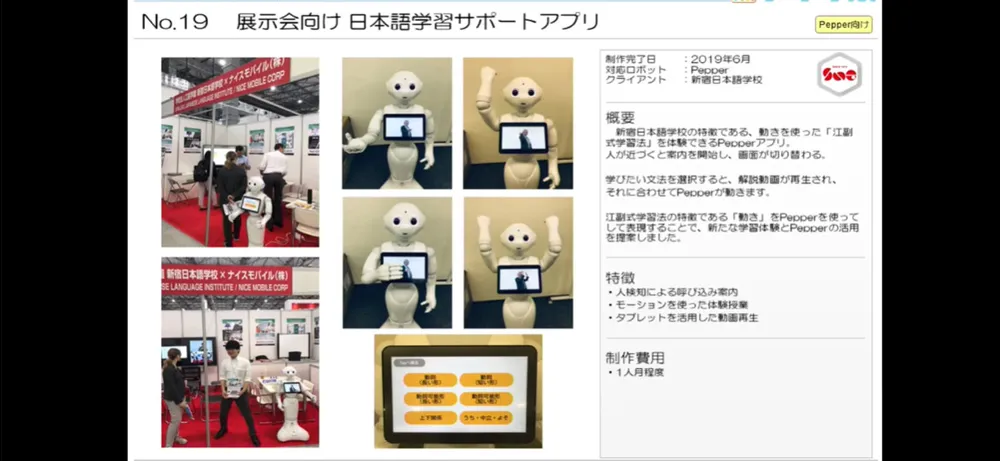 またこの実習生雇用企業向けサポートにおいて、ペッパーくんを用いてジェスチャーによる日本語学習にも力を入れており、そこでも株式会社アイラボ様の開発したロボットアプリが活躍しているとのこと!