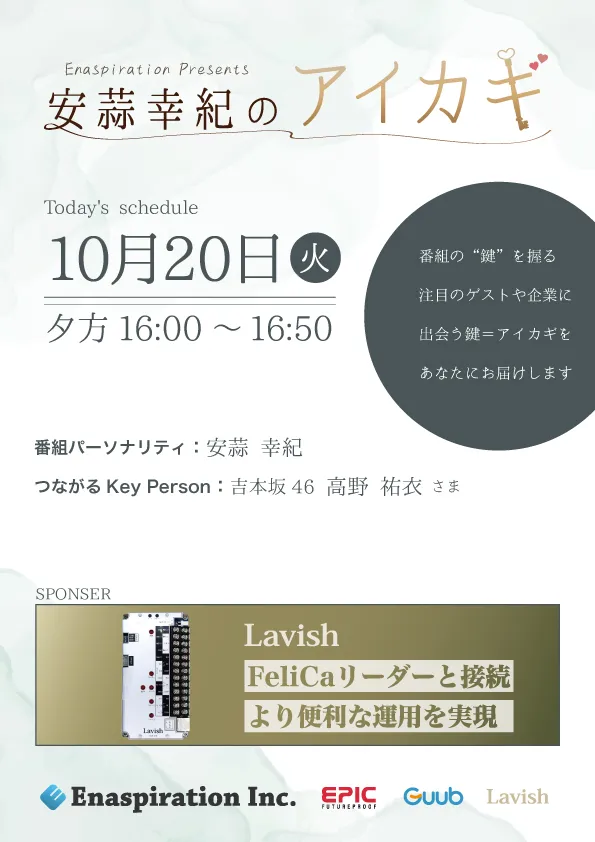 | 16:39 | ****つながるKey Person**ゲスト「高野祐衣様」Key Word:日本酒 |