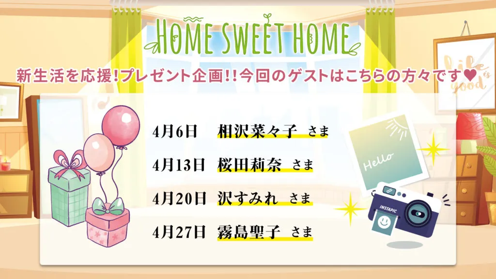 新生活応援プレゼントキャンペーンとして、4月ゲストのサイン入りチェキをプレゼント☆詳細は来週の番組でお知らせいたしますので、来週も是非ご覧ください☆