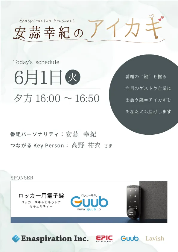 | 16:39 | ****つながるKey Person**ゲスト「高野祐衣様」Key Word:祐衣の酒 |