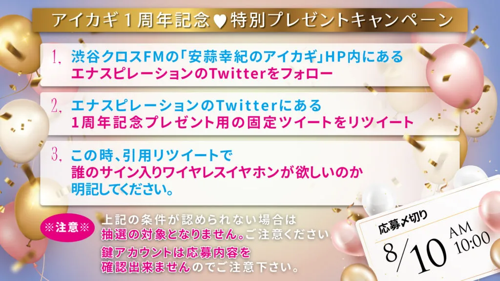 そして冒頭でもお知らせしましたが、「アイカギ」1周年記念ということで!いつも番組を応援してくださっているリスナーの皆さんに、感謝の気持ちを込めてプレゼントキャンペーンを企画いたしました!7月のゲストさんに、ワイヤレスイヤホンへサインを頂き、更に!ゲストさんのチェキもお付けしてプレゼントいたします!!!