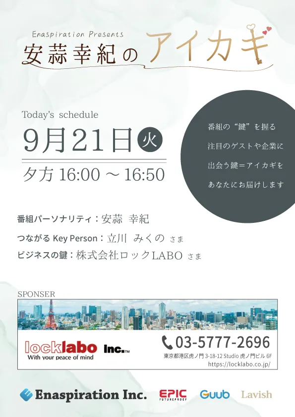 今回は、株式会社ロックLABOの須田さんにお越しいただきました。株式会社ロックLABOでは、日常のメンテナンス工事や、手動ドアを自動ドアにし更に入退室管理が出来るようにしたりと、様々な場面で防犯対策を提供。皆さんの日常生活での不安を無くすためにどのようなことが出来るのか、引き続き立川さんと一緒にお聞きしました!