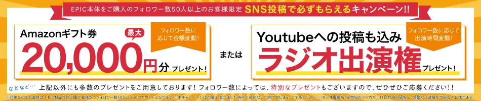 購入したEPIC製品をご自身で撮影しSNSに投稿すると、もれなくラジオ出演権もしくはAmazonギフトカードをプレゼント★