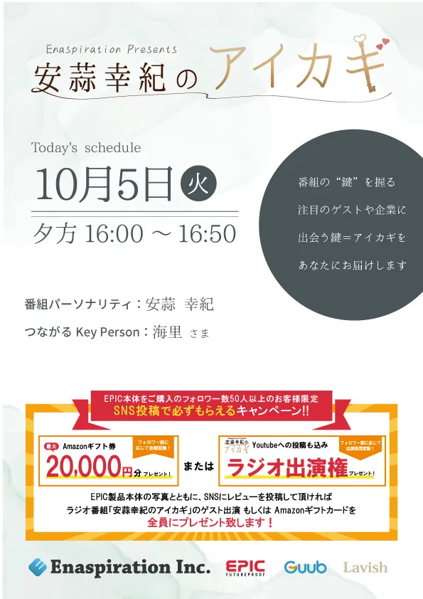 購入したEPIC製品をご自身で撮影しSNSに投稿すると、もれなくラジオ出演権もしくはAmazonギフトカードをプレゼント★