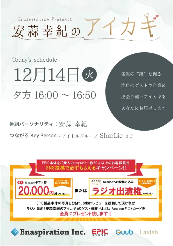 購入したEPIC製品をご自身で撮影しSNSに投稿すると、もれなくラジオ出演権もしくはAmazonギフトカードをプレゼント★